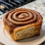 A single cinnamon roll with a thick spiral shape sits on a white plate, showing layers of light golden brown dough with a glossy cinnamon sugar filling spread evenly between each layer. The cinnamon roll's texture looks soft and slightly sticky, with the outer edge having a darker brown baked crust. The background shows a blurry kitchen stove but rests on a white marbled texture. photo taken with an iphone --ar 4:5 --v 7