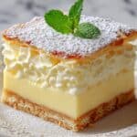 Vanilla Custard Cream Squares feature a buttery baked crust topped with a rich, creamy vanilla custard filling folded with whipped cream for a light, airy texture. This delightful dessert is chilled until set, dusted with powdered sugar, and garnished with fresh mint leaves for an elegant finish, perfect for make-ahead entertaining.