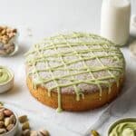 - Make the glaze (optional): Whisk together the vegan pistachio cream spread, powdered sugar, and soy milk until smooth. Once the cake is fully cooled, dust the top lightly with powdered sugar and drizzle the glaze evenly over the surface for an extra luscious finish.